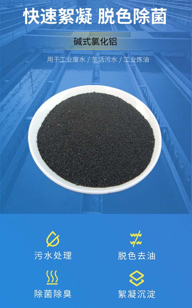 堿式氯化鋁是一種無(wú)機(jī)高分子混凝劑, 固體產(chǎn)品外觀飲用水級(jí)為黑色,其分子為[Al2(OH)nCL6-n]m,n≤5m≤10,由于分子中帶有數(shù)量不等的羥基,當(dāng)聚氯化鋁加入混濁源水后,在源水的PH條件下繼續(xù)水解,在水解過(guò)程中,伴隨發(fā)生凝聚,吸附和沉淀等物理化過(guò)程,從而達(dá)到凈化目的。